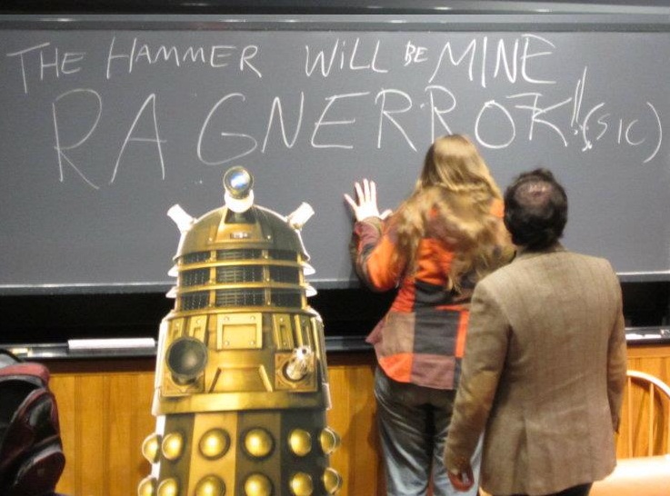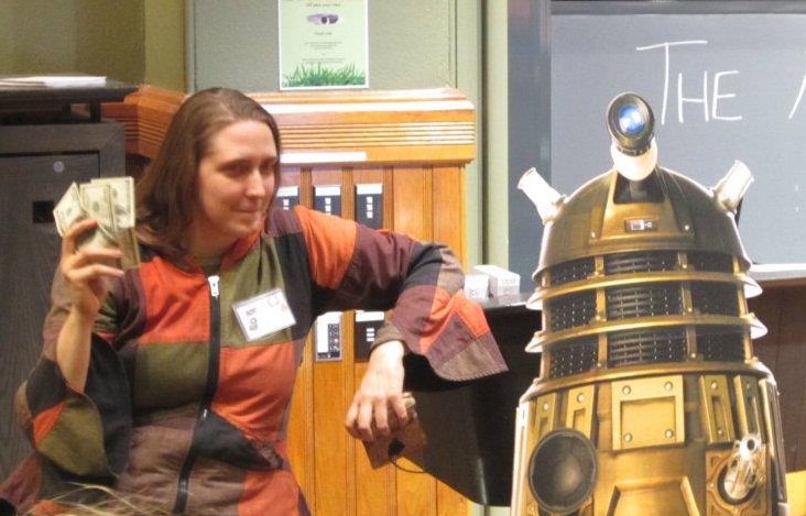 In addition, Sassafrass was delighted to be a part of the first Vericon Charity Auction, which raised $3,500 for Doctors Without Borders. The “Doctors Without [Spatio-Temporal] Borders” auction was themed around Doctor Who, with two hosts dressed as the 10th and 11th Doctors. We auctioned a CD with our recent rough tracks of the Sundown pieces still in production, as well as a fun tote bag with Sundown-themed images. Ada served as the primary auctioneer. One of the auction items was a cardboard version of Thor’s hammer, left over from the MST3K mocking of the deeply MST3K-worthy film Almighty Thor. Ada in her persona as Loki fought valiantly to win the hammer and bring about Ragnarok, and the crowd came forward forming first a coalition of Good to stop her, then a coalition of evil to aid her. In the final fervor, the hammer sold for $700 to the forces of good, who trounced Loki, prevented Ragnarok, and made a fantastic contribution to bringing medical aid to the corners of the world most in need of it.