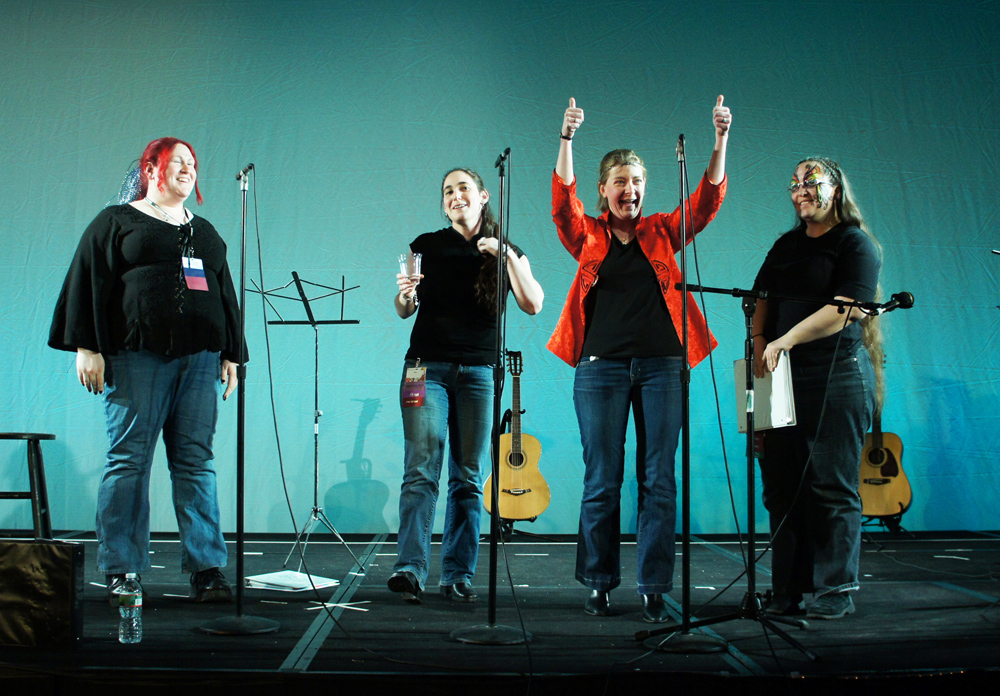 Friday night, we had a chance to celebrate once more with Mark and Barbara, and see how happy they are in their new life together. Much of the weekend was spent in pleasant company, good games, and interesting panels, for the most part. But we did get a chance to see three concerts, all of which were spectacular. Heather Dale and Ben Deschamps, the Music GoHs this year, were spectacular as always, and it was great to hear some of the music from their newest album. S.J. “Sooj” Tucker gave an amazing performance. Each set of performers backed up the other, and it was awesome to see them work together so beautifully. The other great concert we experienced was the Chromatics, a delightful group of NASA scientists who are also a professional a cappella (in this case, “astro cappella”) group. We got a chance to talk to them after the concert, and were able to perform “Somebody Will” for them – one of the more appropriate audiences we’ve ever had for that song. Thanks again to the members of the group for the music exchange!