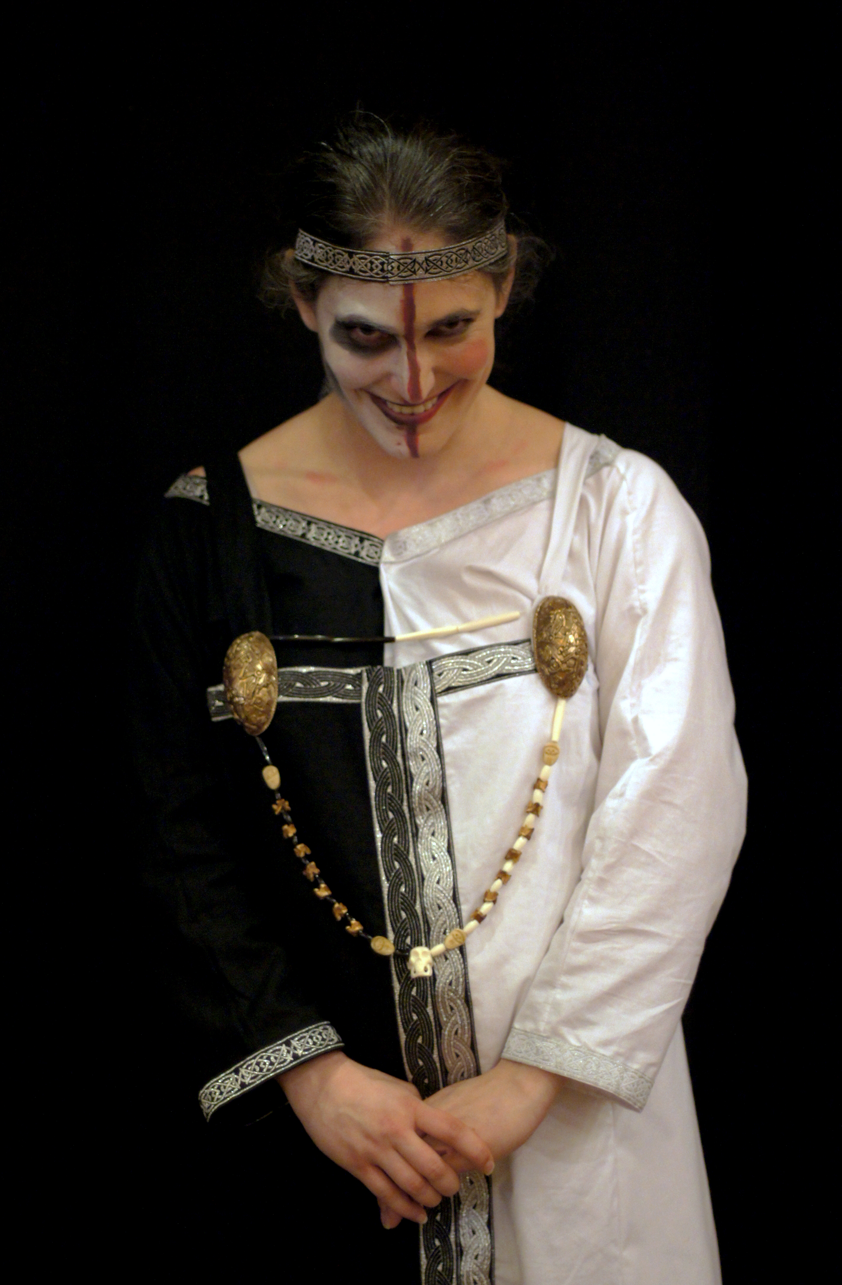 SONY DSCHella wears a traditional apron dress but half black and half white to match her inhuman coloring, and beads of bone instead of glass. Baldur wears gold and white, decorated with gilt embroidery, with a studded belt depicting the rising and setting of the sun. The Seeress’s costume is directly based on a description of a visiting seeress from the Saga of Eric the Red, which describes her strange wooden belt and pouch, her leather hood and decorated mantle, her brass-tipped staff decorated with stones, and other details.