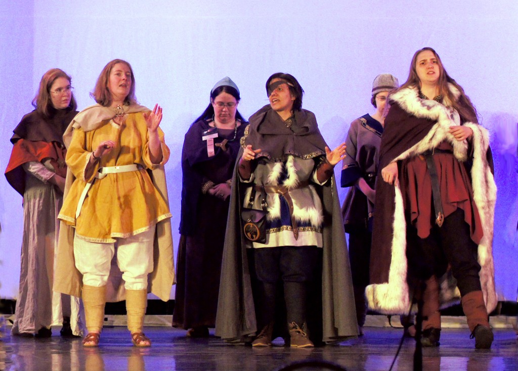 Also indispensable was Marc Dunn of MAD Craft of Vermont, who creates extraordinary custom period and period-inspired leather and metalwork. He created all our most unusual costume pieces, including metal-studded leather belts for Odin, Loki and Baldur with character-specific decorations depicting runes, monsters and the sun, and accessories for the Seeress, including her leather hood, wooden belt, and her staff (which, following Marc’s clever design, comes apart to fit in a suitcase.) Marc’s services are very affordable, and he can be reached at madcraftofvt [at] gmail.com